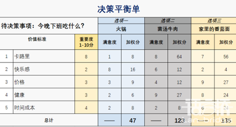 比如決策今晚下班吃什么,你既想要減肥,又想要好吃,還想要省錢,一頓飯得滿足多種需要,自己左右為難,內心糾結。這時候一個決策平衡單,填入你的待選項,再填入你的需要(價值標準),標注好重要程度,就來打分,如下圖,就吃家里的番茄面吧!