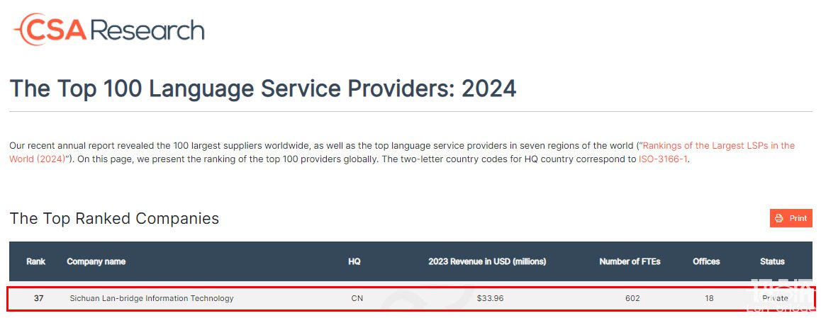 根據(jù)四川日?qǐng)?bào)報(bào)道,語(yǔ)言橋已成功入選國(guó)家語(yǔ)言服務(wù)出口基地。根據(jù)CSA國(guó)際權(quán)威排行,語(yǔ)言橋已連續(xù)多年入選 CSA Global Top 50 語(yǔ)言服務(wù)供應(yīng)商。2025年,在國(guó)際權(quán)威第三方機(jī)構(gòu)——Slator發(fā)布的"The Slator 2025 Language Service Provider Index"(2025年語(yǔ)言服務(wù)提供商指數(shù))中語(yǔ)言橋位列全球翻譯服務(wù)提供商第30位。與此同時(shí),語(yǔ)言橋已榮獲ISO9001:2015質(zhì)量管理體系認(rèn)證、翻譯協(xié)會(huì)會(huì)員、AAAAA級(jí)筆譯服務(wù)認(rèn)證、AAAAA級(jí)口譯服務(wù)認(rèn)證等多項(xiàng)殊榮。