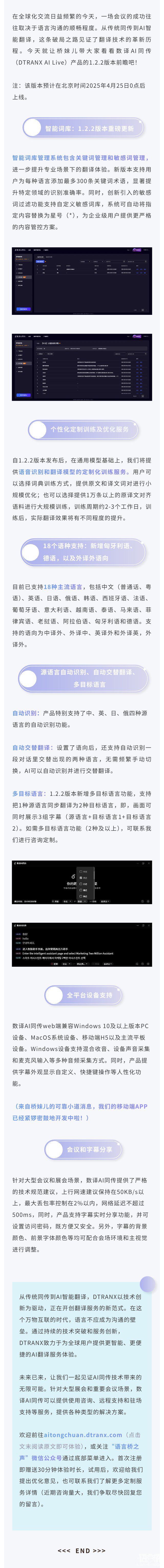 "數(shù)譯A同傳又雙叒愛更新啦!上周四我們發(fā)布了最新的V1.1.4版本。本次更新帶來了多項(xiàng)實(shí)用功能,讓橋妹兒帶大家一起來看看吧~ "...[查看更多]
